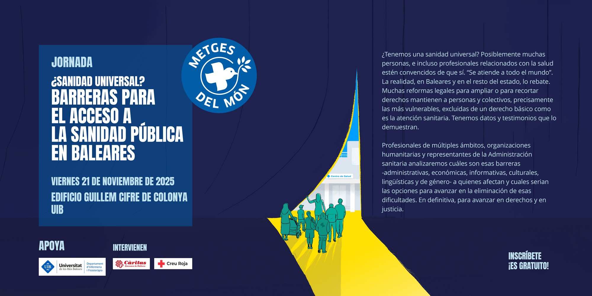 Metges del Món Balears organitza la jornada ‘Sanitat universal? Barreres per a l'accés a la sanitat pública a Balears’. Una trobada en la qual professionals de diversos àmbits, organitzacions humanitàries i representants de l'administració sanitària analitzaran quines són aquestes barreres d'accés a la sanitat pública, a qui afecten i com avançar en la seva eliminació.