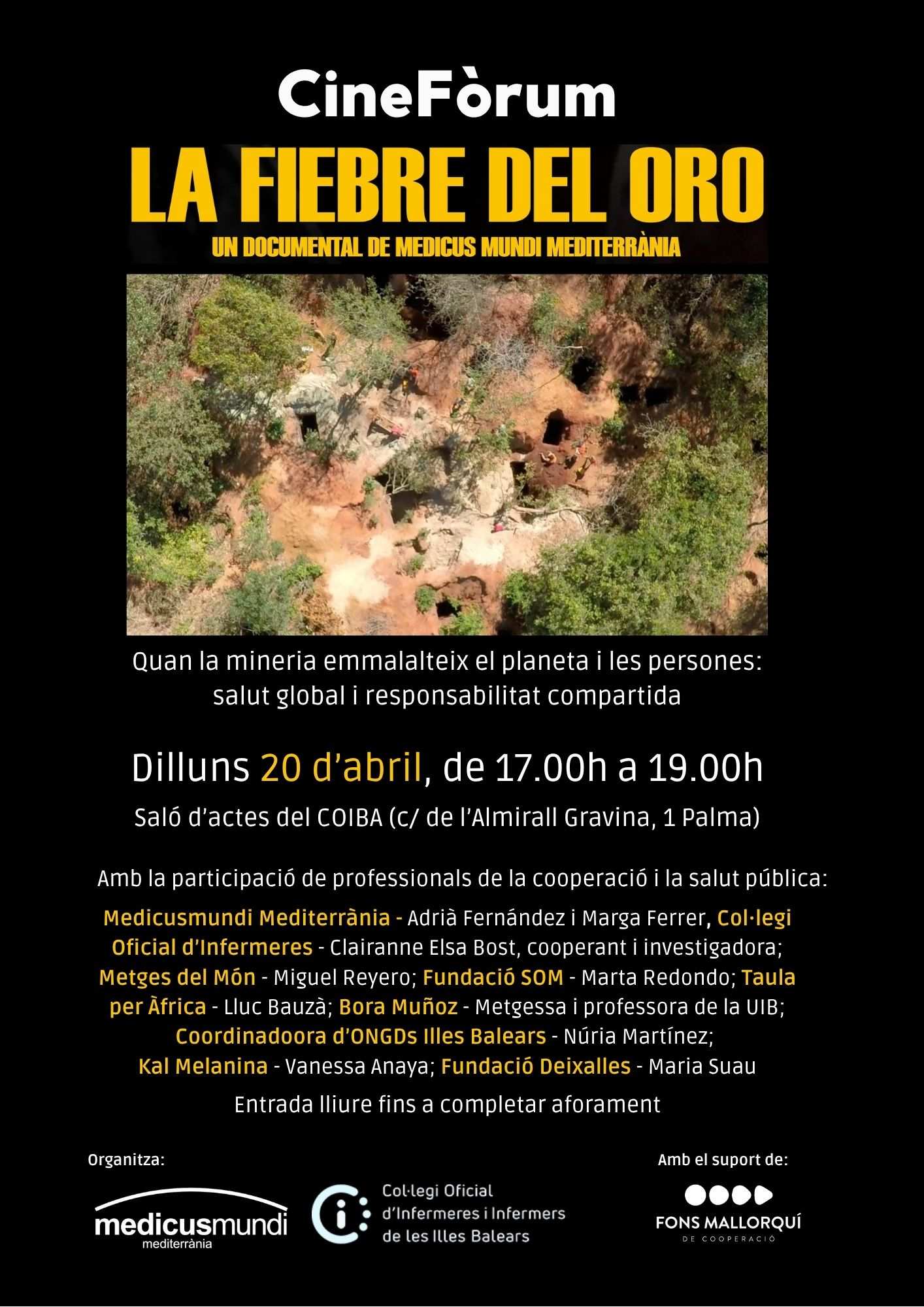 Medicusmundi, amb la col·laboració del COIBA, organitza el CineFórum “La febre de l'or: salut global i responsabilitat compartida’ a la seu col·legial de Palma el 20 d'abril. El documental «La fiebre del oro» de medicusmundi Mediterrània i Kanaki Films serà el punt de parida d'un col·loqui amb professionals de la cooperació i la salut pública sobre com la salut és inseparable de factors econòmics, socials i ambientals: Què determina realment la salut de les persones? Les condicions de treball? El medi ambient? Les decisions econòmiques globals?